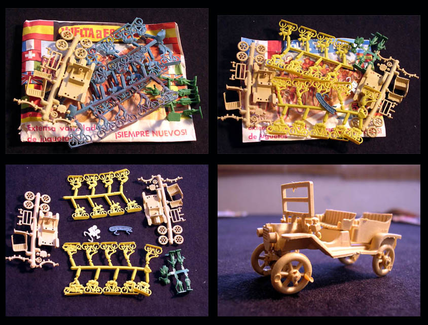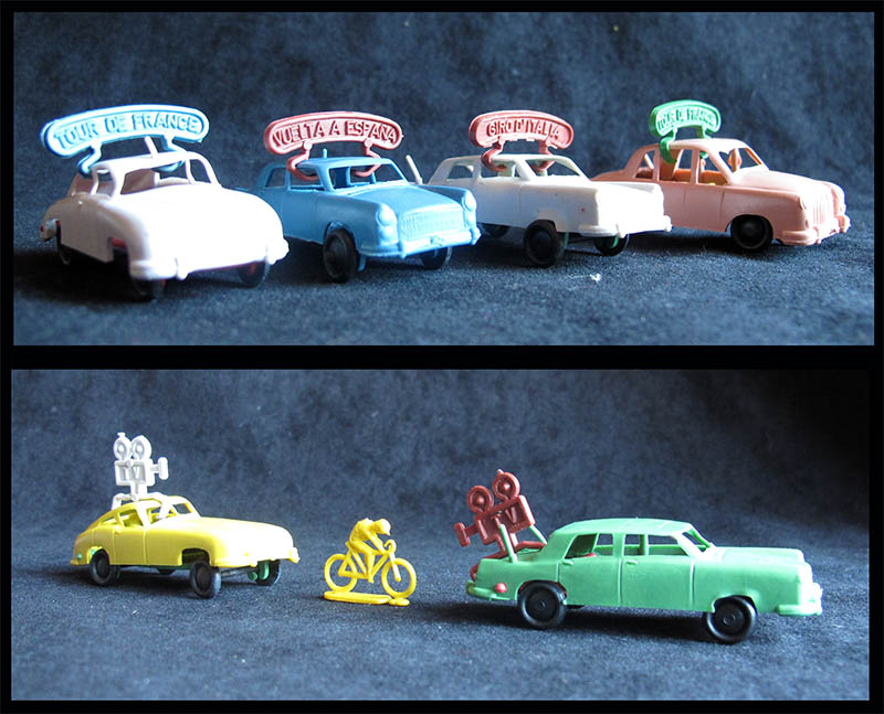 One quite common thing you could find in the bags are those complements (camera and/or banner). These fit any 1/72 car. However I never found any matching car in a cycling Montaplex bag. You could find completely different cars (scroll down to see the weird Ford T), or you could find cars as those shown here in other Montaplex bags.