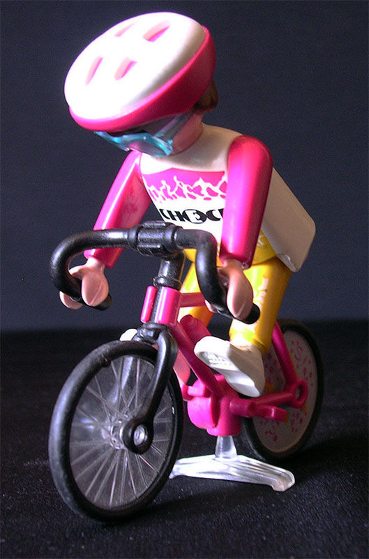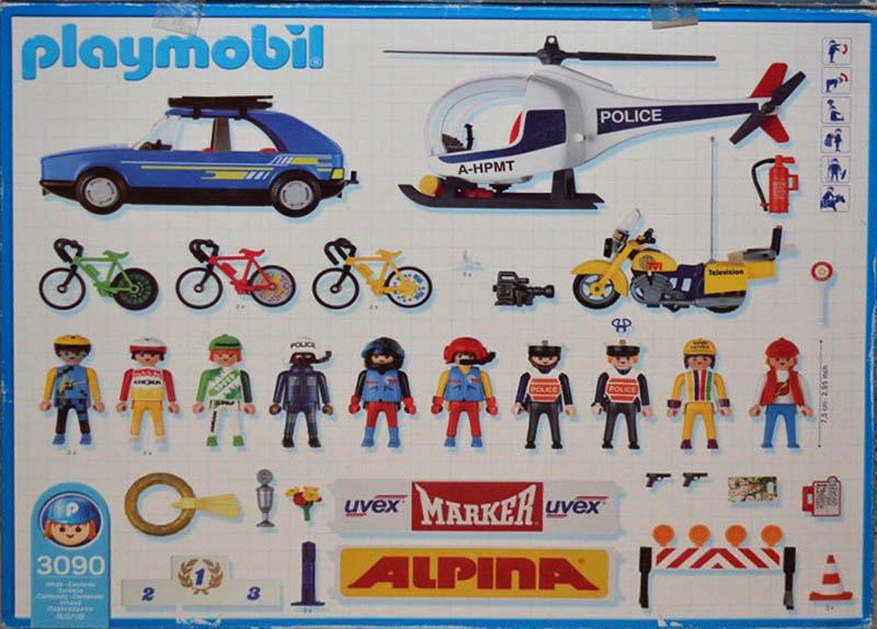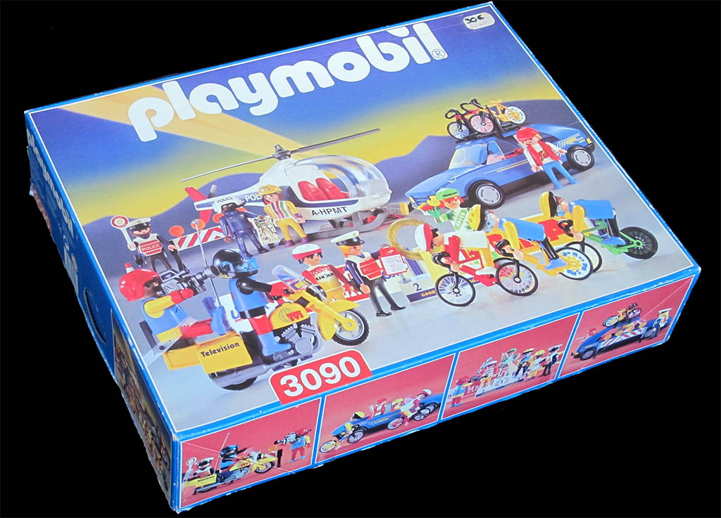 Playmobil is a German line of toys produced since 1974. The signature Playmobil toy is a 7.5 cm tall (1:24 scale) human figure with a smiling face. A wide range of accessories, buildings and vehicles, as well as many sorts of animals, are also part of the Playmobil line. In 1998 they released (at least, in Spain, but I guess they released them in other countries too) a series of boxes that represented a cycling race.