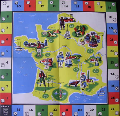 Most copies of the game have lost the cardboard riders. If this is the case with yours, I have included a ready-to-print high resolution scan of mine HERE (also available from the "make your own cycling game" section of the site). Notice the multicoloured die. Fortunately, It can be replaced by a normal die if it is lost or damaged.