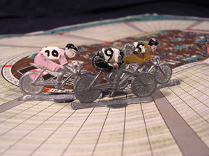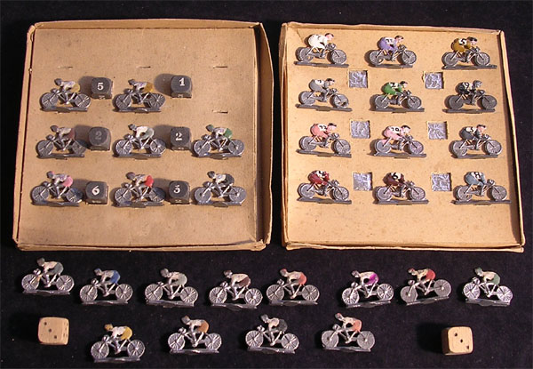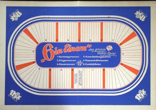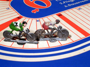 Old german track cycling game with metal riders. I guess it can be considered the German veldiv game. There are some different versions of the game. There is the box containing metal riders and a quite disappointing box. The smaller box contains only the riders (no board, no rules) while the envelope contains a much more elaborate board.