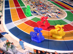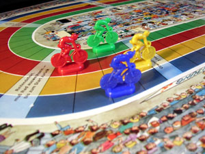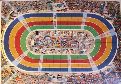 Promotional track cycling game from Germany. This is not a game from former Eastern Germany (as I thought), but a promotion game of the big automotive engineering company VDO. (Thanks, Siegfried, for the correction). The game itself is not specially interesting, it is remarkable just for the Speedometer (a spinner, actually) used instead of a die, and the Totalisator (a cardboard lap and points counter).