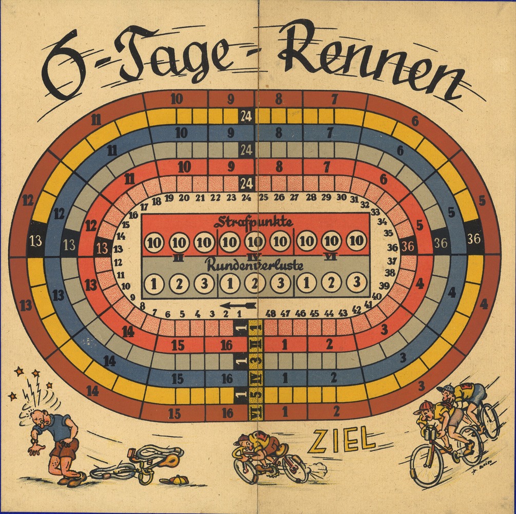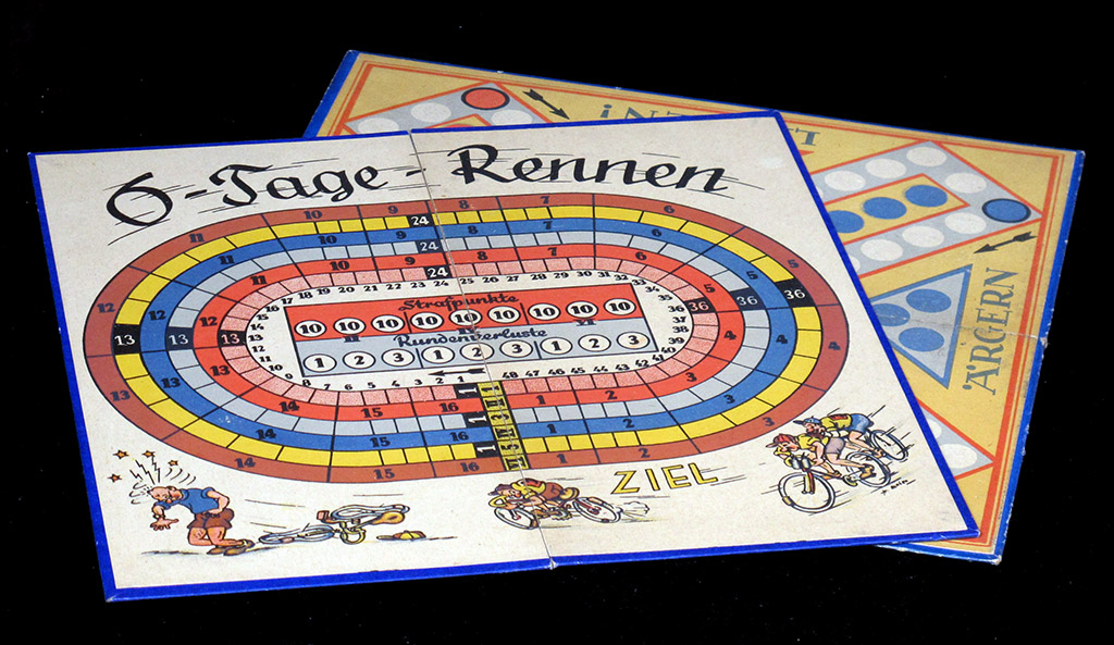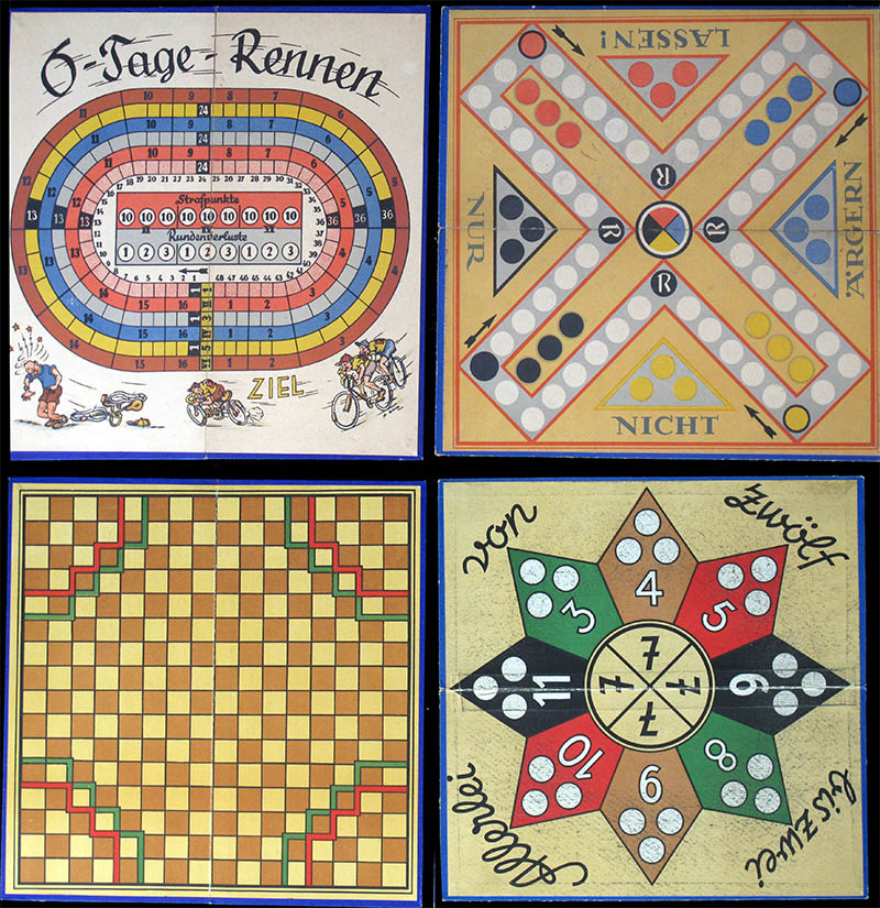 In Germany, Parcheesi/Ludo games (technically called cross-and-circle games) Were introduced during WWI. They are known as "Mensch ärgere Dich nicht" and have a distictive board. Both the name of the game and the specific board design were protected by some kind of patent and/or copyright (let's leave the technicalities aside). This is surely why the game found with 6-Tage-Rennen has a different name (which nevertheless means basically the same in German) and a different layout.