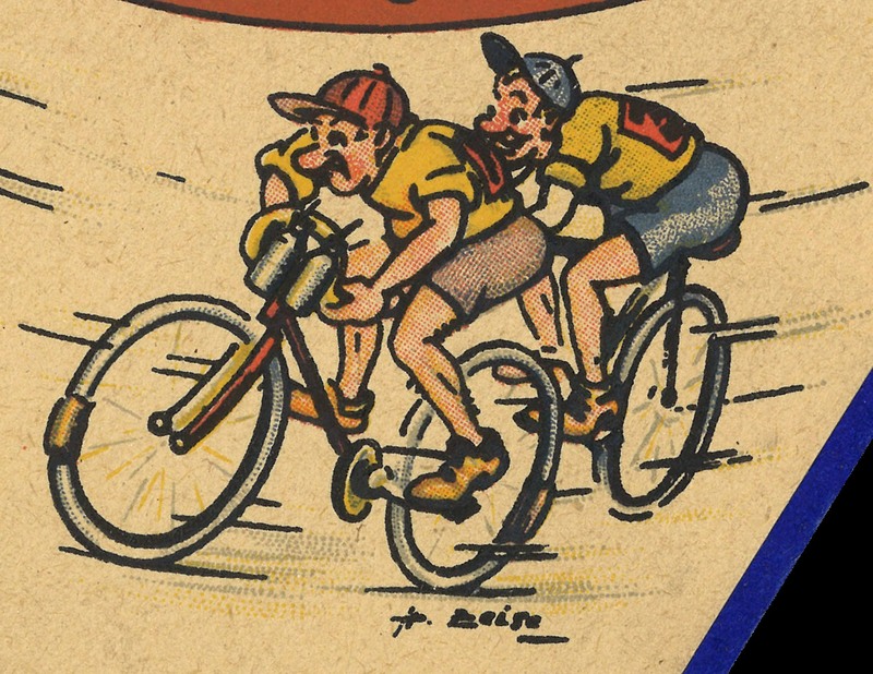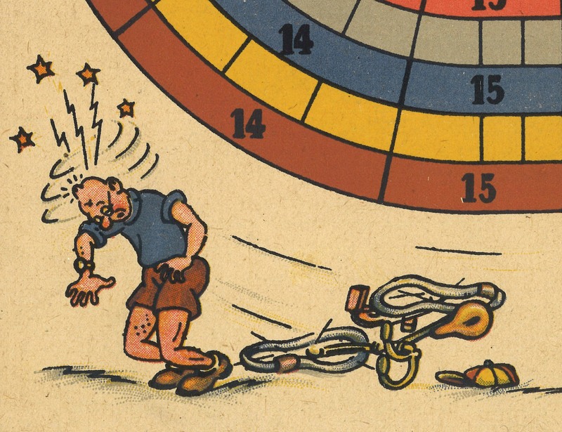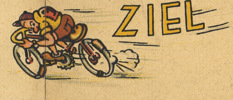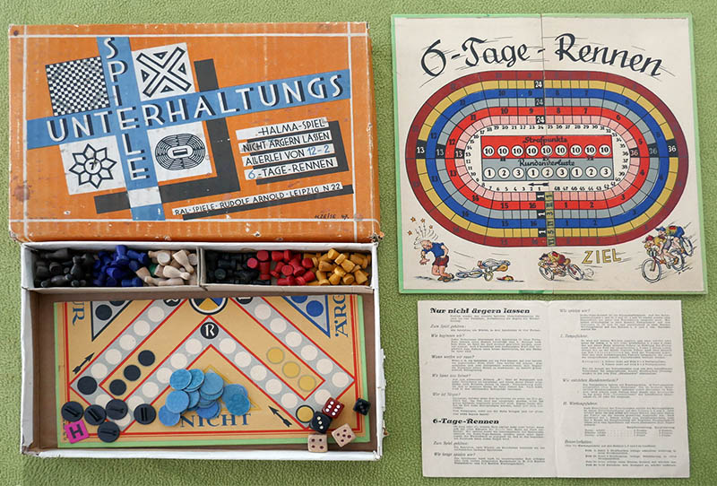 Unlike the Rudolf Arnold board mentioned above, in this case it is the cycling game that is coupled with the Halma board, while "Nur nicht ärgern lassen!" is coupled with "Allerlei von zwölf bis zwei". However the coincidence is important enough to make me think that the cycling game was probably made by Rudolf Arnold too. Whether it was made before the war (in which case the parcheesi/halma game would be a later reprint) or not is hard to say until I find more information.