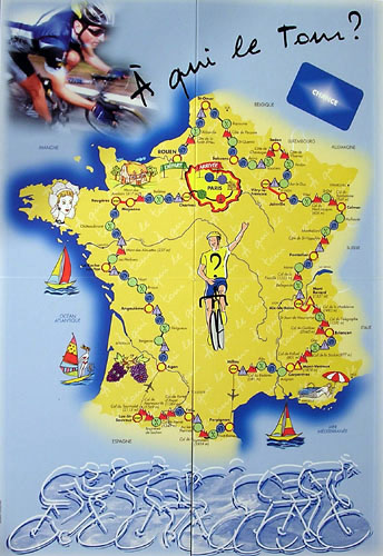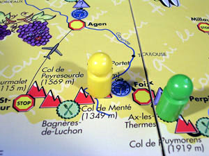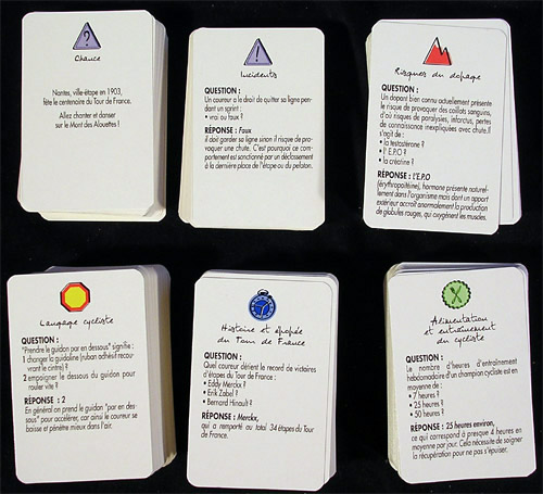 The six categories are: "Langage cycliste", "Alimentation et entrînement du cycliste", "Histoire et épopée du Tour de France", "Risques du Dopage", "Incidents" and "Chance". The latter do not imply a question, they are what their name says, chance cards with which you may advance or go back some squares.