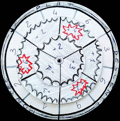 There is a "Pace Wheel" (and again a simplified version for the junior game) made of three concentric circles which indicate the number of squares traveled per turn depending on the terrain and pace (outer circle), the additional necessary points to start a successful breakaway (middle circle) and the additional necessary points to successfully counter a breakaway (inner circle). You get the idea...