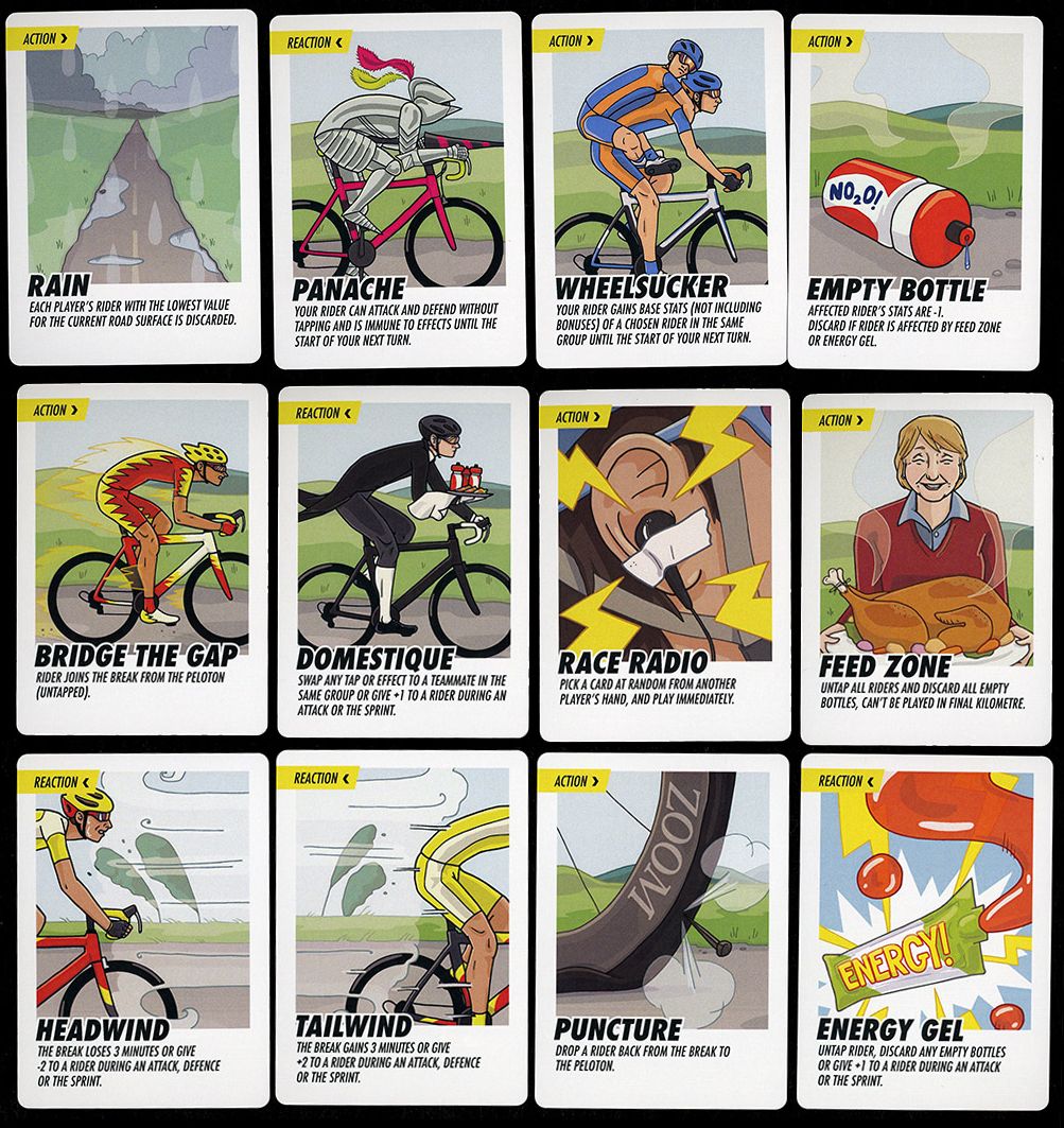 Besides trying to bridge or extend the gap, one can play some special "action" or "reaction" cards which affect the course of the race.