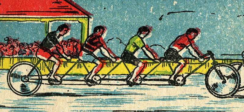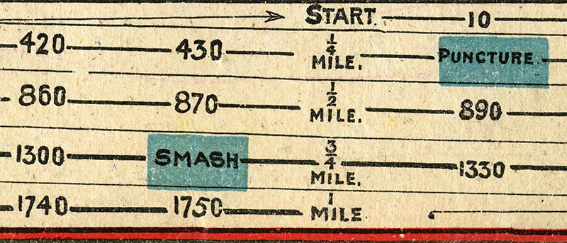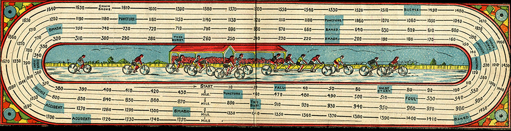 This is a simple turn-of-the-century English game. It is a simple folded cardboard measuring 51 x 13 cm (when unfolded), with the rules printed on the back. The rules state that "any number may play, but each player must have a bicycle". However, I have never seen bicycles -or dice, for that matter- included with this game, and of course they can be replaced by counters. The number of dice to be used is not specified.