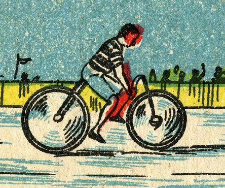I am not an expert (yet?) in the history of the bicycle, but I think the rider on the left has lost the pedals and chain. No wonder he is the last in the race. On the other hand, the cyclist on the right rides a safety bike typical from the 1890s.