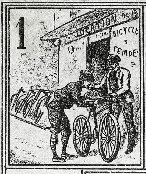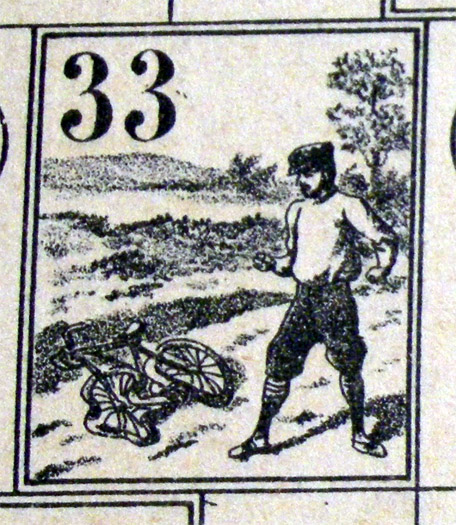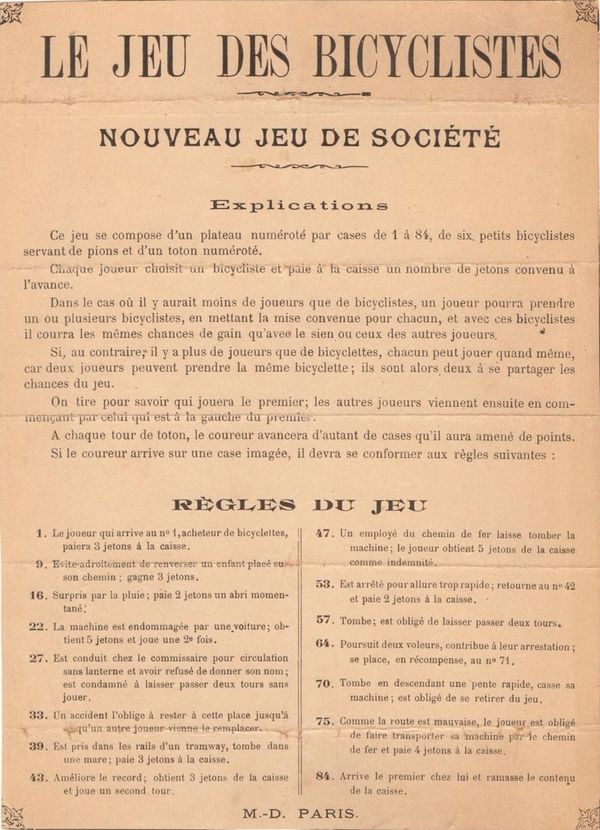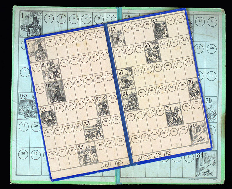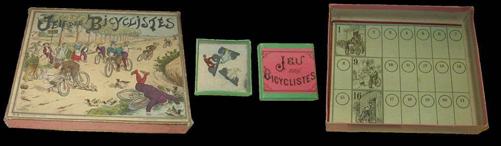 The rules of this game are quite hard to come by. (This game has been many years in the "missing rules" section of this website). Fortunately, Didier's copy had the rules, which mention six small bicyclists, to be used as counters, and a numbered teetotum. Both the rules and the use of the word "bicyclists" have a distinctive (though not conclusive) XIXth century flavour.