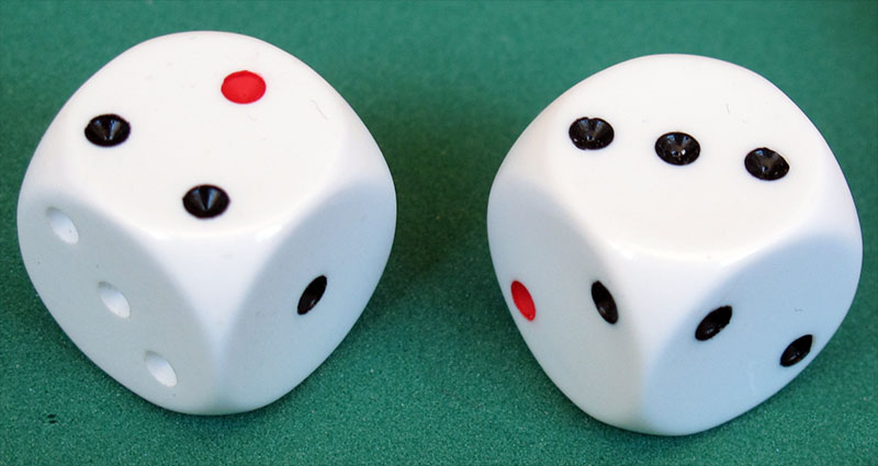 The game uses special dice (drilled one by one by Jos Noben himself). The red dots represent half a point. As you can see the values on the dice are 3, 3, 2 1/2, 2 1 1/2, and 1. There are tho different 3's (painted/unpainted) because there is a rule about throwing the same number with both dice, and it just applies to either two painted threes aor two unpainted threes , but not to one of each.