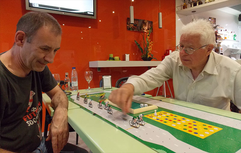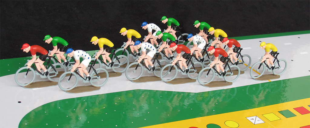 There are three different kinds of riders you can buy for this game (check the game's website, link below). The basic riders are the small monochrome ones which you find in so many games (including my own Maillot Arc-En-Ciel). These are probably the best for the small board but the "peloton feel" mentioned above is somewhat lost with such small riders on the big board. Myself, I tried the metal Roger's the first time I played the game, and I do not want anything else, despite they are the most expensive. (As an advantage, they are less expensive than if you were to buy them separately).