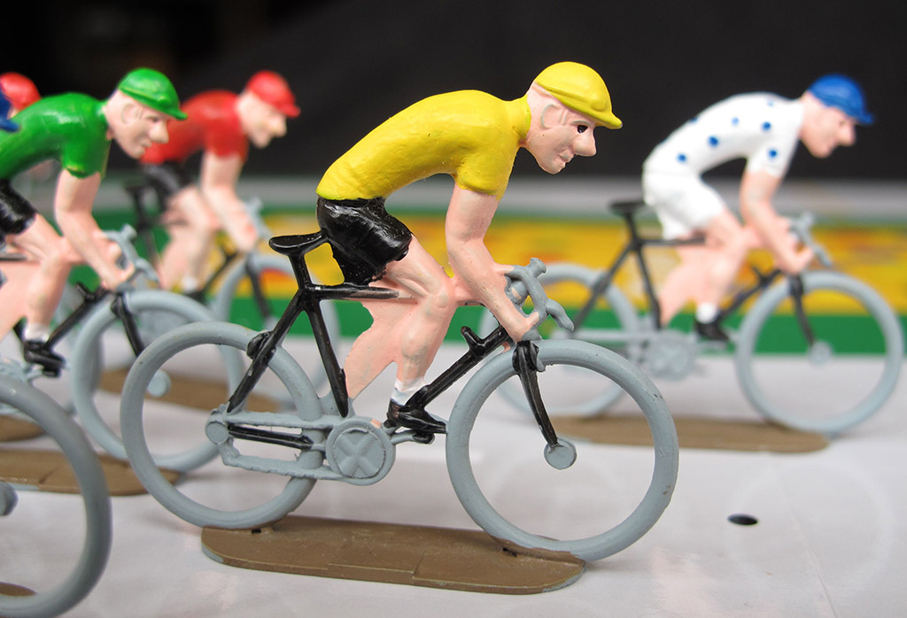 Of course, you can use your own riders, if you have some from other games. All you need are sixteen riders in four different colours, ideally yellow, red, green and blue. As you can see, 1/43 Norevs are perfect, even if the colors do not match.