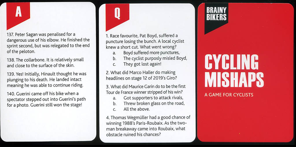 My favourite set is "Cycling Mishaps", of course. Most of the existing trivia games are explicitly based on the Tour de France and "Famous Cyclists" is not an unusual subject either, but "Cycling Mishaps" is unexpected.