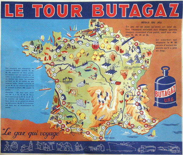 Another Butagaz promotional game(-of-goose). Unlike the 1934 butagaz game which was printed on paper, this one is printed on a 31 x 36 cm cardboard.