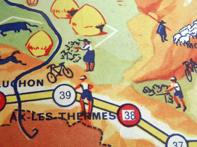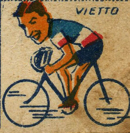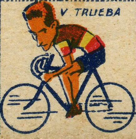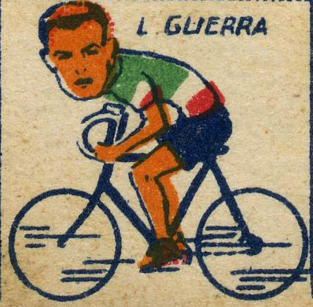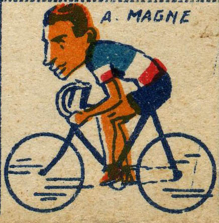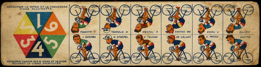 I wrote: "Learco Guerra, Kurt Stöpel, Edgard de Caluwé, Vicente Trueba, Antonin Magne and René Vietto. Of them, De Caluwé and Vietto are the youngest and their presence indicates that the game was probably not made before 1934 (ore else by a visionary). On the other hand, the absence of earlier stars like Alfredo Binda or Charles Pélissier (both of whom were active but well past their prime by 1935), or later superstars like Gino Bartali or even Sylvere Maes, is why my guess is that the game was made around 1935. Still, I cannot explain the absence of Romain Maes, winner of the Tour de France that year (except that the game was made just before the Tour) or of George Speicher, winner in 1934. However, it is worth noting that all the riders in this game except Learco Guerra took part in the 1935 Tour de France. What is quite weird is that only one of them made it to Paris, and his results were not so good anyway (René Vietto, 8th).