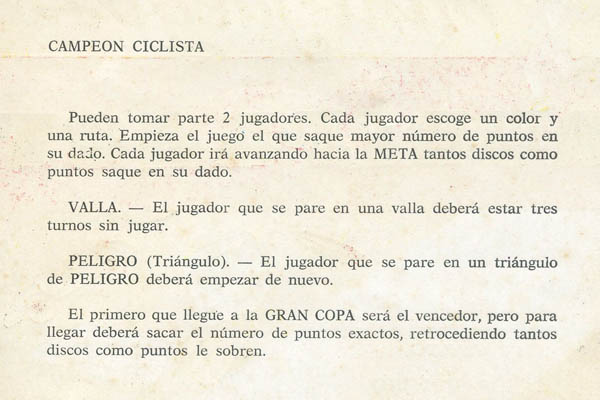 Small (15 x 15 cms) Spanish game, belonging to series of games that includes the usual games (chess, checkers, ludo, game of goose...) as well as a car race and a football game (which I have never seen).