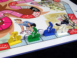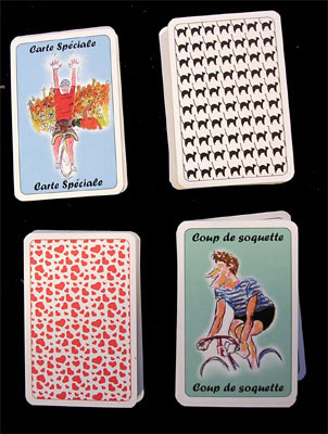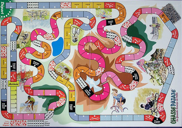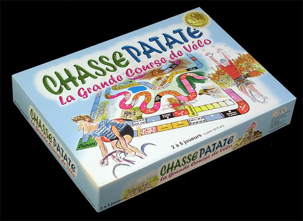 In this case we find teams of two riders (climber and rouleur). We also find 10 dice marked 1-2-3-4-BLANK-BLANK, but these are used as markers for the missing turns. The advance of the riders is controlled by two normal dice. A rider arriving at a black-and-white square draws a "chasse patate" card (which is bad), while a rider arriving at a red-and-white square draws a "grand seigneur" card, which is good. At the start of the games, the players receive some +2, +3 and +5 "tactic" cards (called "coup de soquette") which are played after the throw of the dice.