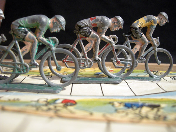 So I can be pretty sure that there are at least two riders missing (numbers 4 and 5, of course) but I wonder what colour they were. If these numbers have any relation with the game thy might be both yellow or one yellow and one red striped. Any of both possibilities would lead to 2 teams of three riders, two teams of 4 riders and one spare riders. It might make some sense (compare with the Eddy Merckx game, where there are also spare riders to be added to the teams depending on the number of players). Another possibility is that the two missing riders formed still another team, which would lead to a team of 4, two teams of 3, two teams of 2 and still a spare rider.