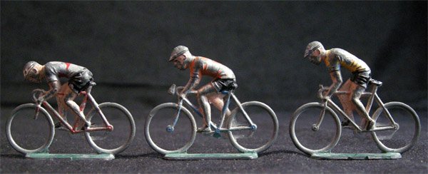 Green cyclists (3): numbers 9 (Bartali), 10 (??nti) and 11 (Ollin)