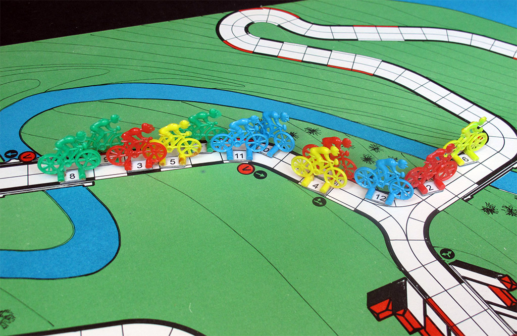 The game is what I call "an ambitious game", one that wants to represen as many aspects of cycling races as possible. It is meant to represent a stage races, with classification by time and/or by points, but it also can be used to play a single one-day race. We find different types of terrains and all riders have different abilities.