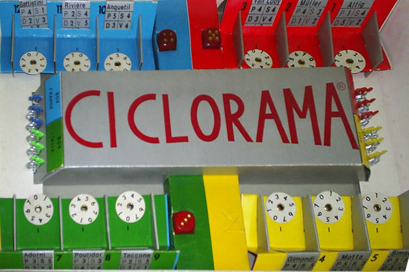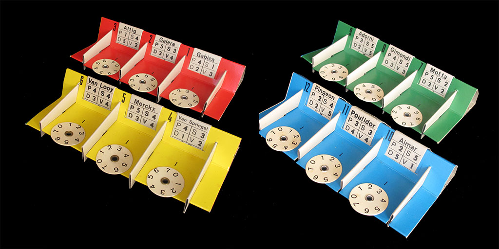 Though the teams are named after countries (in this case Italy, Belgium, France and Spain), the riders do not exactly match these countries. We find three italians (Adorni, Gimondi and Motta), three frenchmen (Aimar, Pingeon, Poulidor), three belgians (Merckx, Van Looy, Van Springel), two spaniards (Gabica and Galera) and a german (Altig). One might think that the teams are national teams and that the Spanish team has been strengthened with a German rider. Nothing is further from the truth. The fact is that before the start of the race the players draw by lot who has the right to chose first , and players select their riders according to their values and the kind of race the they are going to play, and not of their nationalities.