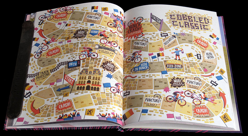 British cycling clothing manufacturer Rapha has recently issued a cartoon-formatted annual called "The Power Of Pink" to commemorate American cycling team Education First's 2019 season (or maybe, more accurately, Rapha's and EF's partnership). In this book, among cartoons, puzzles, quizzes and various pieces of trivia, we find this beautiful board by illustrator by Chris Dickason, supposed to be a game representing a classic cycling race.