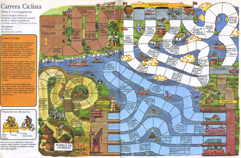 This is a series of books I remember from my youth which contained toys and games to cut, paste and play. The series is not originally Spanish, they are adaptations of Anne Civardi's books. Dennis Franck informs me that the title of the English book is "The Knowhow Book of Action Games" and the game is called "There And Back", but beware, not all the editions of the book carry the game. There are abrifged editions (with 32 pages instead of 48) in which this game is missing.