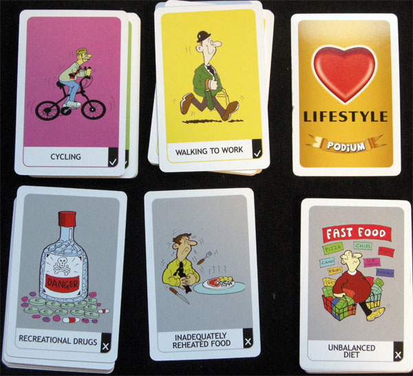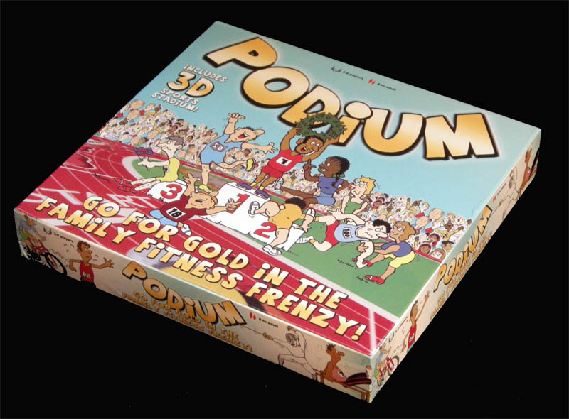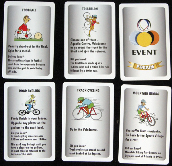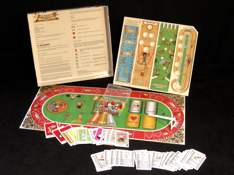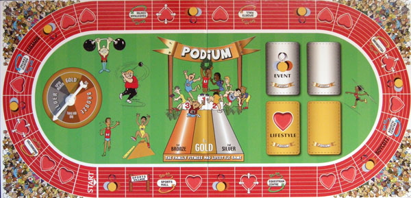 There is a spinner on the athletics track, though this one is a regular chance spinner. Players move around this track trying to collect positive lifestyle cards. When they have collected six of them they move to the podium and try to collect medals.