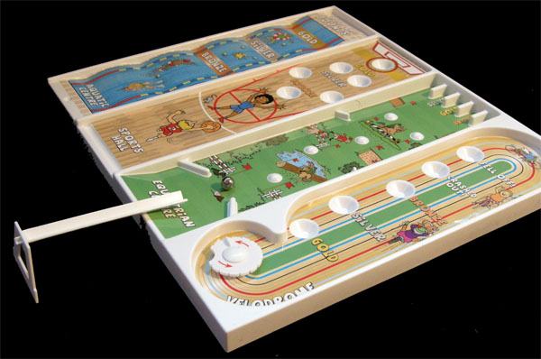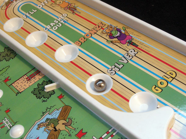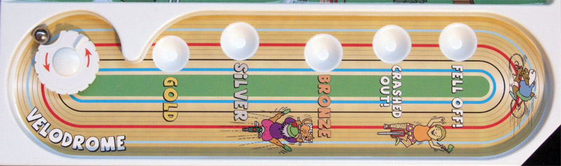 The cycling track has a spinner with which you try to put the metal ball in the best possible hole. It does not work too well, it is difficult to put the ball in a hole (any hole)
