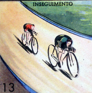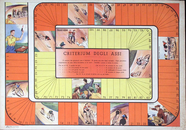 An old italian board. Very simple game with nice graphics. It is named after the "Criterium des As", which was a race held at a circuit at Longchamp near Paris at the end of the season to which only the best riders of the season were invited. This board measures 35 x 50 cms.