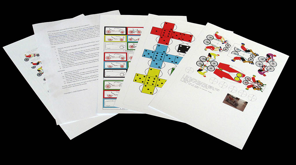 What is not included in this game is the board. The rules simply say "Find a track to run the races on, this can be the outside squares of a chess board (28 squares) or the 4-part CYCLE TOUR printable board (52 squares)". Of course, you can find more tracks to print in the "Make Your Own Game" section of this site. However, do not get too excited about downloading tracks: let me warn you that the odds of an underdog rider beating the favourite change with the length of a track; for the game to remain balanced, you have to use the same track for all six races.