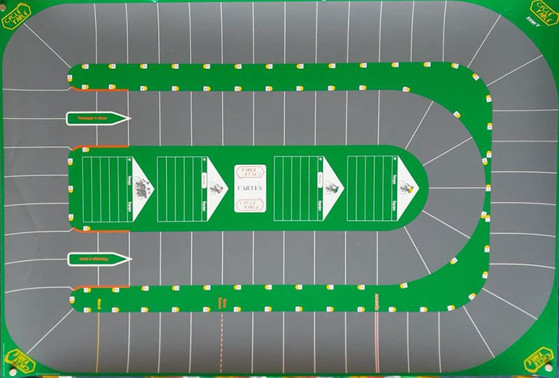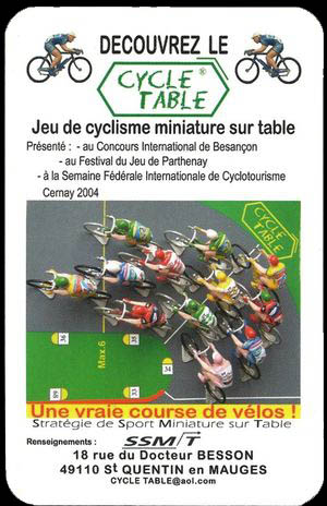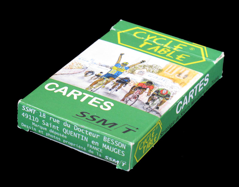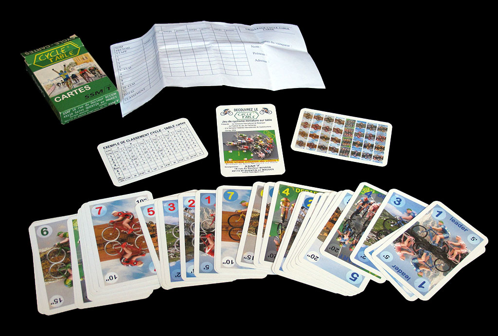 This is a cycling-themed card game produced in Saint Quentin en Mauges, France in (or around) 2004 by "SSM/T". It is a shedding-type game, one in which the player's objective is to empty one's hand of all cards before all other players.