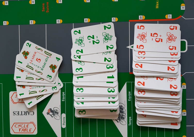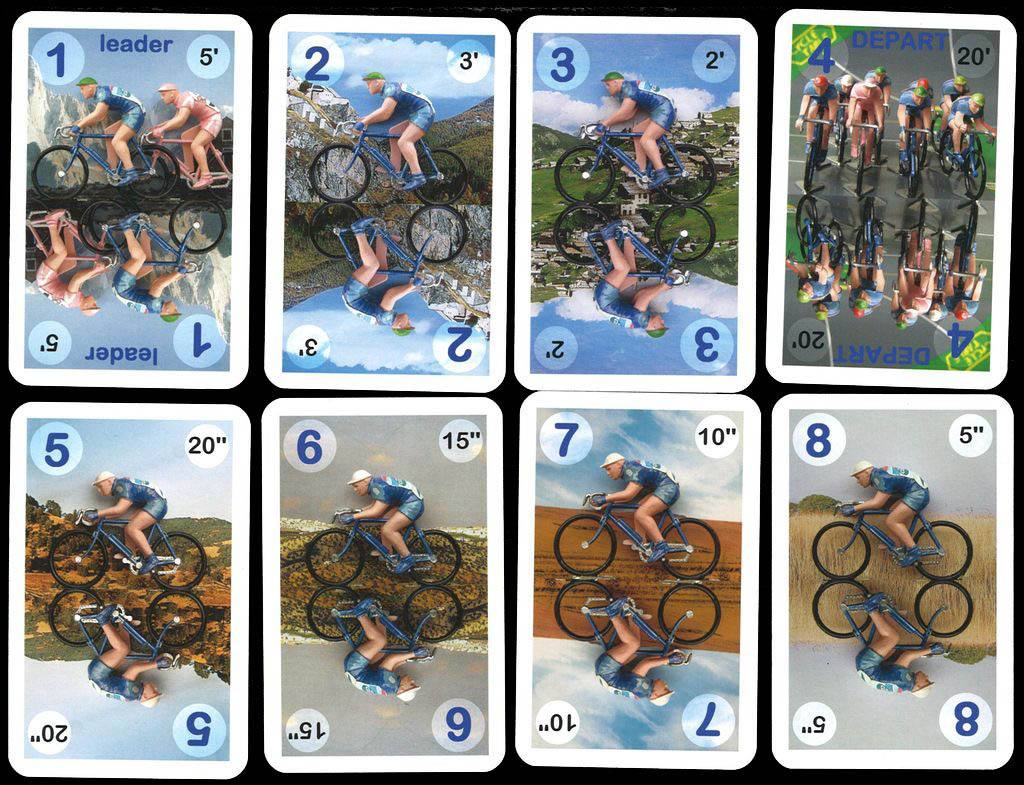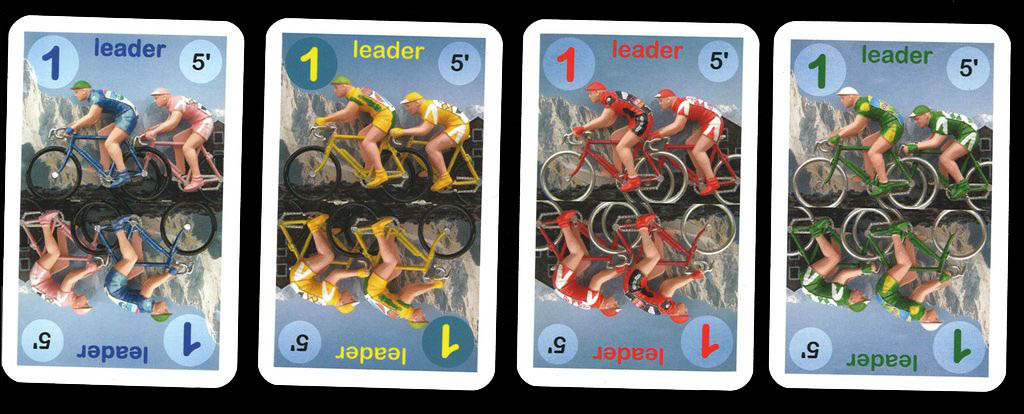 As you have probably noticed, the cycling figurines depicted on the cards are made by the Fonderie Roger. The number in the upper right corner of the cards is the time you lose if you do not get rid of that card at the end of the game.