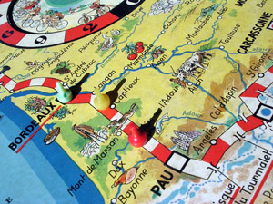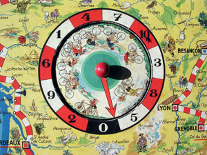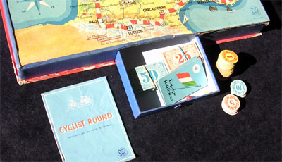 Beautiful post-war game. Strangely enough, the name of the game is English (though the game is French, and the game is subtitled "Nouveau jeu du Tour de France"). The rules are very simple. I took the photos from Geert Lagrou's copy.