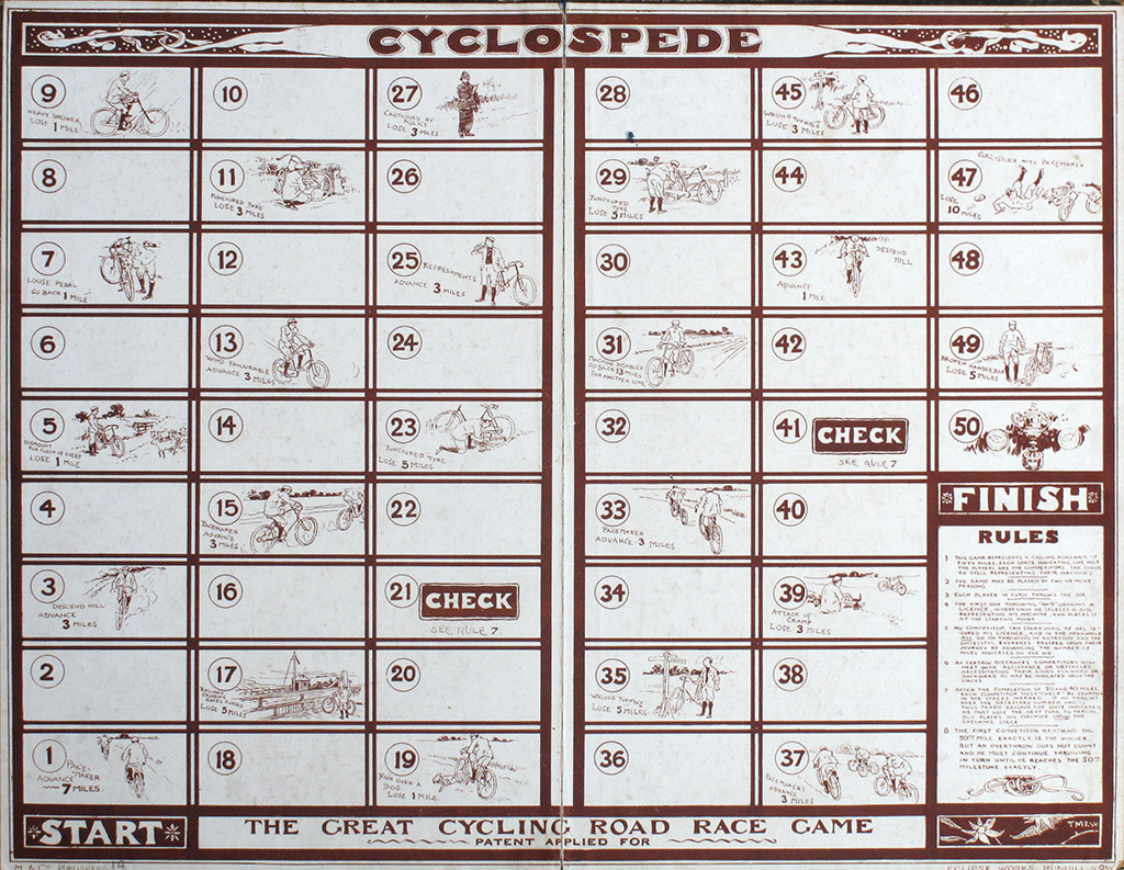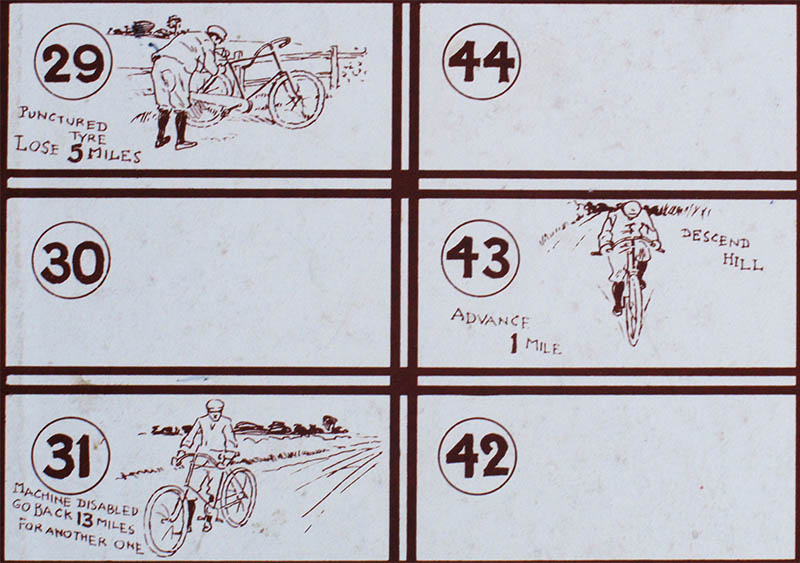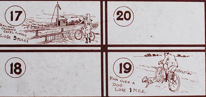 Before starting the race, the players must "obtain a license" by throwing a 4. Although the game is of course based on the game of goose, this particular rule is reminiscent of Ludo (or Parcheesi), which was introduced in England at the end of the XIXth century. (Not that this helps particularly for dating the game, since it just confirms what was already obvious).