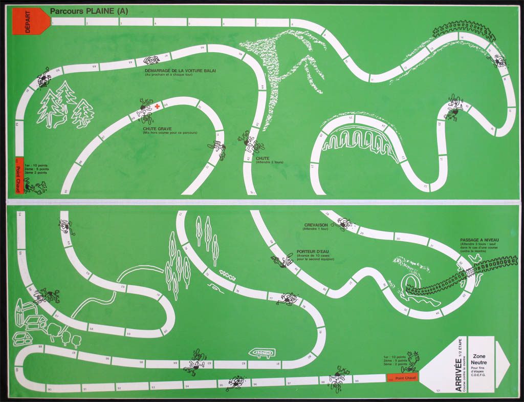 This game is big (the box measures 65 x 28 cms) and heavy, specially due to the seven (!) boards included. Five of these boards are just different finishes for various stages. Another board ("parcour montagne") can be either the end of a stage or a stage in itself, while the bigger board "("parcours plaine") is the one used in mosts races.