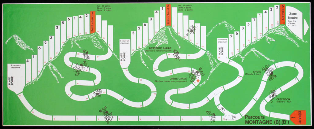 For mountain stages, movement rules change. Before a climb, riders have tos stop compulsorily in the "Plateforme" field before the climb (in which there can be no more than three riders at a time). Then, during climbs, to progress to the next field riders must throw exactly the number inscribed in that field. If the field ahead is blocked by another rider, you must throw the number corresponding to the first free field, to which you will move. As a result, riders tend to form pelotons in the climbs, and these pelotons disband quickly in the descents.