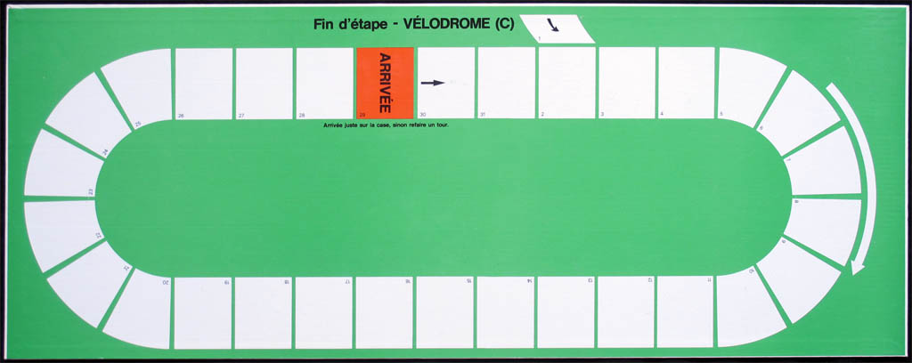 Another unusual feature of this game are the different stage finishes. Riders have to arrive to the neutral zone (last field) and then they move onto that particular stage finishing board. What is most unusual is that every finish has different rules. For instance, in end of stage G you have game-of-goose rules, while in end of stage F you move forward with even numbers but backward with odd numbers. In the velodrome, you have to fall exactly on the finishing stage or else ride another lap. A flat stage can end with a climb, using the B' part of board B.