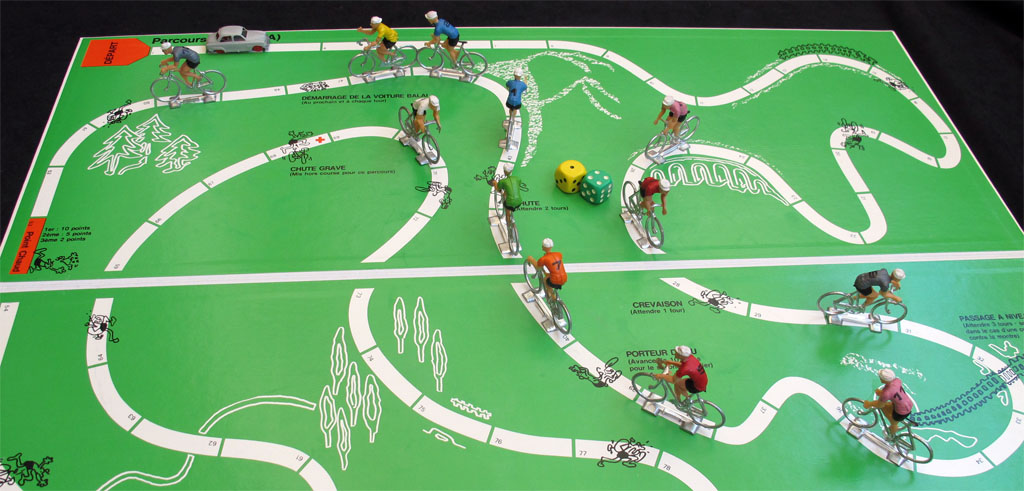 A maximum of six players manages a team of two riders each. The riders are seventies' Cofalus (5cms, smaller than the ones featured in later games like l'Echappée Infernale or Les Géants de la Route), and two extra riders are provided for the yellow and green jerseys. The riders are oversizer for the board (which is nevertheless quite big), and there is also a trailing car (voiture balai) which is an Aronde (scale HO), though I an not 100% sure if it is the original car included with the game (every time I see a copy of this game it has a different car).