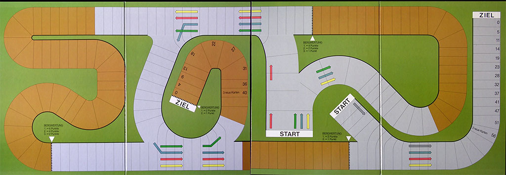 The movement of the riders is controlled by cards. There are 10 different types of cards (99 cards in total), which are quite self-explanatory. There is a 12-page booklet with the (German) rules, plus a sheet with advanced rules, as well as some score sheets.
