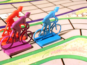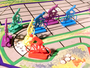 The most interesting rule in this game is the aspiration mechanics. It only applies for flat or downhill riding (which is quite usual), and it only applies for small groups of two or three riders (neither for a lone rider nor for a big peloton): If two or three riders are riding in a small group, the last can progress to the front of the group (so the group as a whole gains an advantage of one extra square) as long as all the riders in the group agree to do so. What is original (I can't remember any other game with such a rule) is the fact that this applies only to small groups.