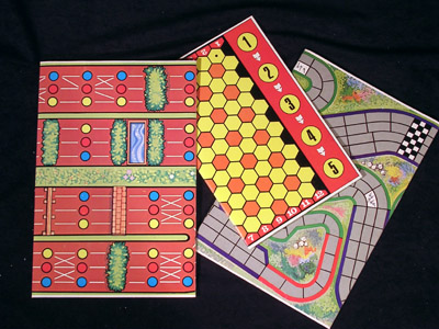 This game has a spinner instead of dice: The green area (to be used on the green-rimmed part of the track) is for descent, the blue area is for flat land and the red area is for uphill riding (in this case the speed is fixed to three squares).