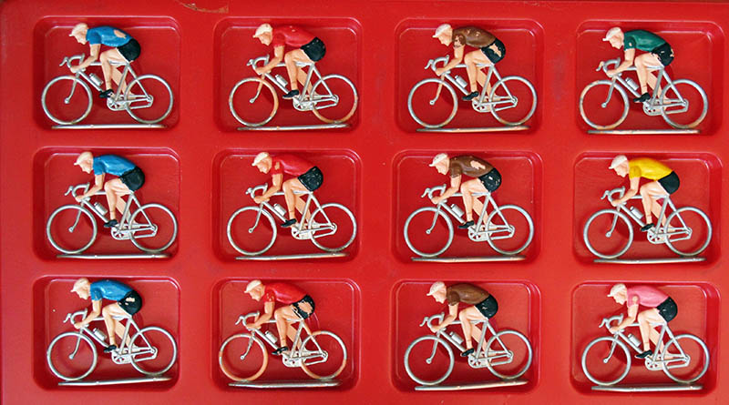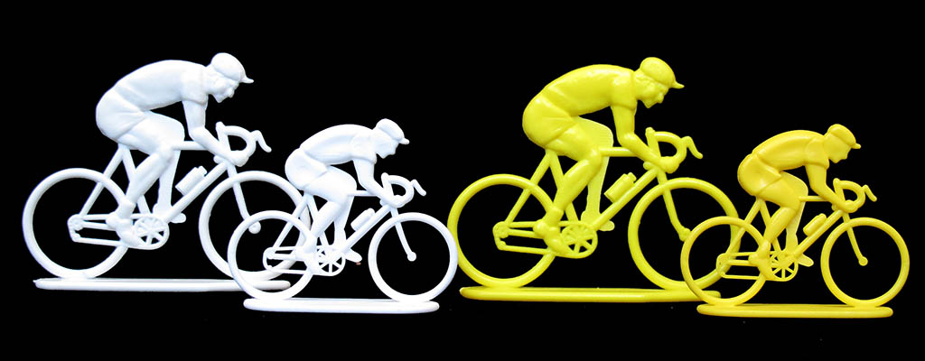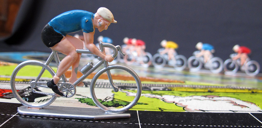 The writer of the rules is not exactly modest: "vous avez devant vous un des jeux les plus passionants du siècle". I would not say that much, but I have always liked this game. It is a good example of a simple game which nevertheless features "cycling" rules: a rule for mountain passes, a handicap for breakaway riders, and it is one of the first games to have an aspiration rule. In this case, you may draw from the rider in front of you if you like his throw of the dice. (To prevent the possible boredom of the peloton just making a translation movement everytime the leader throws a high number, the road gets narrower every once in a while, and a rider may only draft from another rider in the same lane. Some lanes get blocked sometimes, but the shape of the peloton keeps changing in a quite natural way).