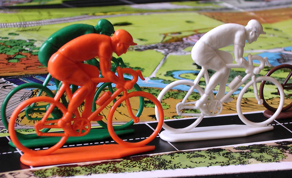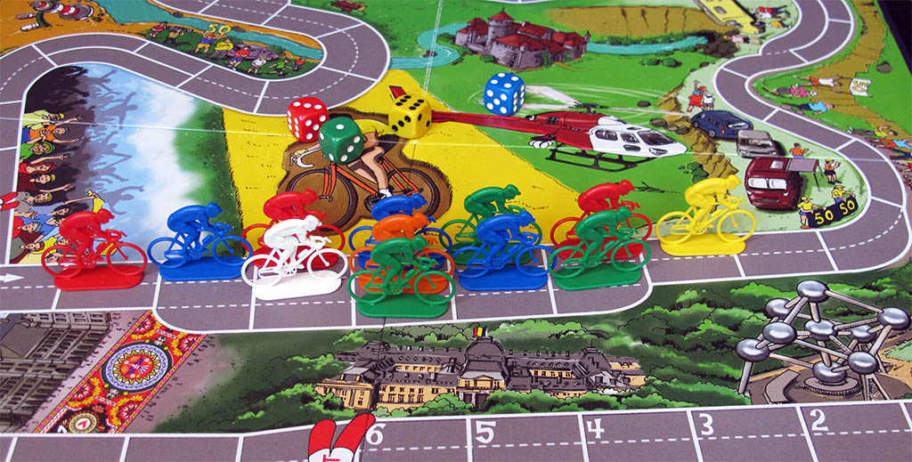 This game represents a a one-day race, in which cyclists must complete three laps and a half around a circuit (not unlike the World Championship), with prices (money) at each lap. The winner is the team who got more money, not the one arriving first after the last lap. It is a regularity race.