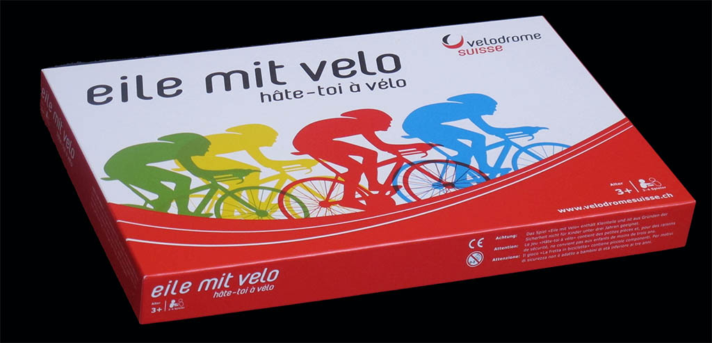 This game was made for the opening of the Tissot Velodrome at Grenchen, near Bern. The title of the game is a play on words with the game "Eile mit Weile", which is the way the Swiss call their own variation of Parcheesi (while the Germans call the game "Mensch ärgere Dich nicht"). Unfortunately, the game is sold only at the Velodrome premises. That is why, although the staff are really helpful once you get there, it has taken me almost ten years to find a way to get my hands on the game.