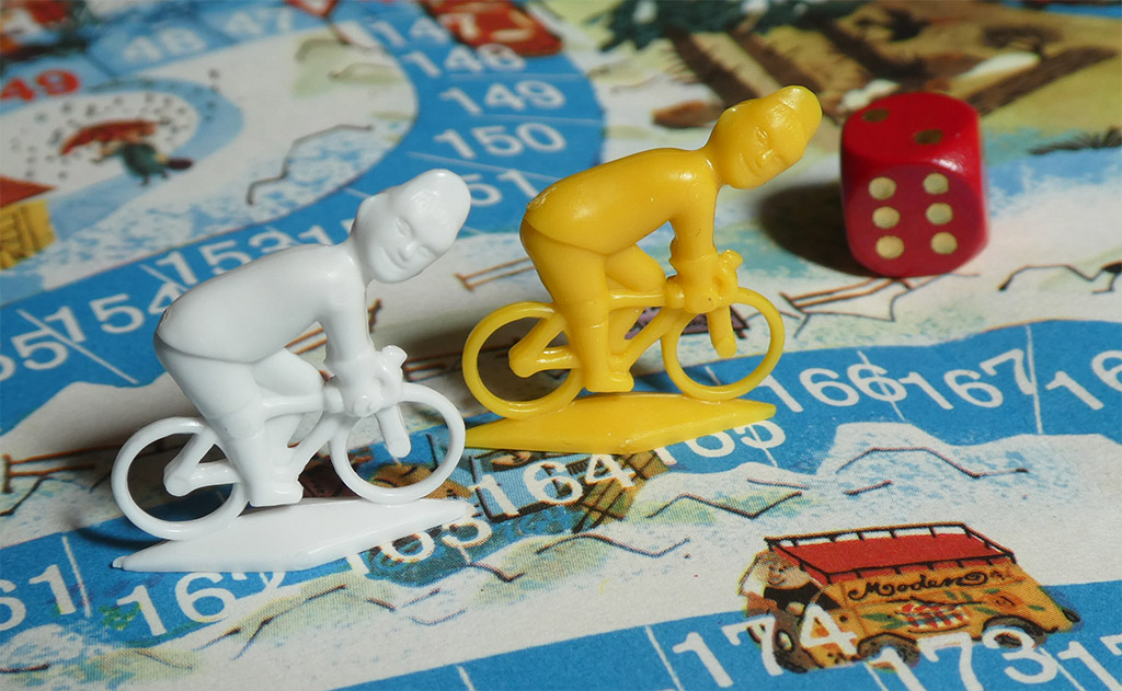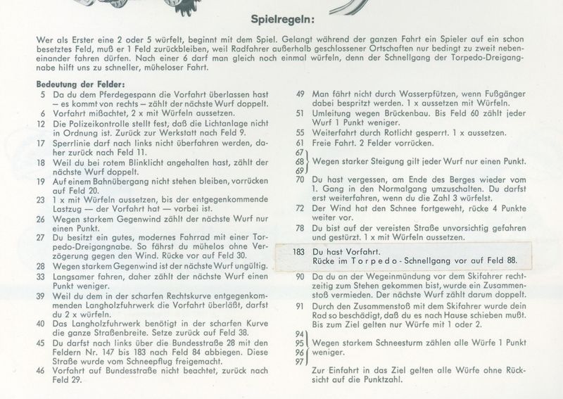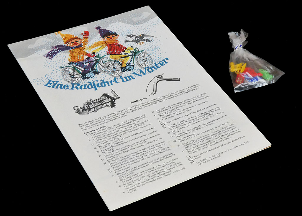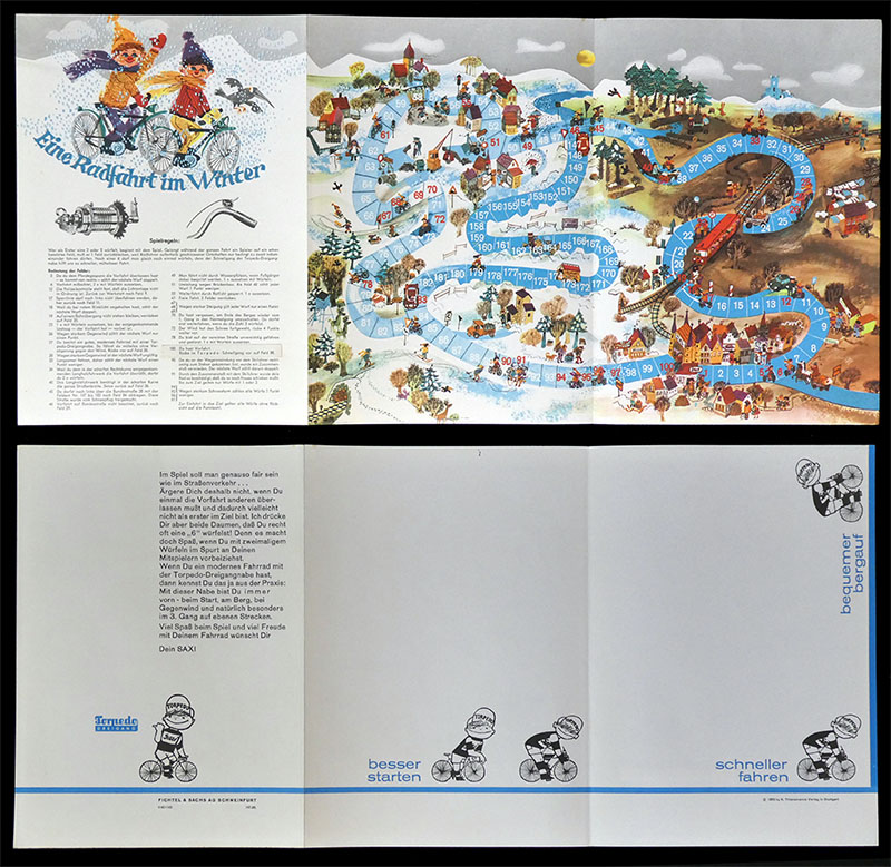 This game was issued as a promotion for the Fichtel & Sachs Torpedo three-speed derailleur. I do not know much about these things, but it looks like this piece of gear, or at least some version of it, is still in production.The game consists of a three-fold A4-sized sheet, two sides of which have the game board while the third has the rules (see below). Along with the game came a small bag with six cute little plastic cyclists and a small (10 mm) wooden die. It is legitimate to wonder whether these implements were part of the original game or if they were added by some previous owner, but most copies of the game I have seen (not that many, really) have the same cyclists and die, so we can safely assume they were part of the game.