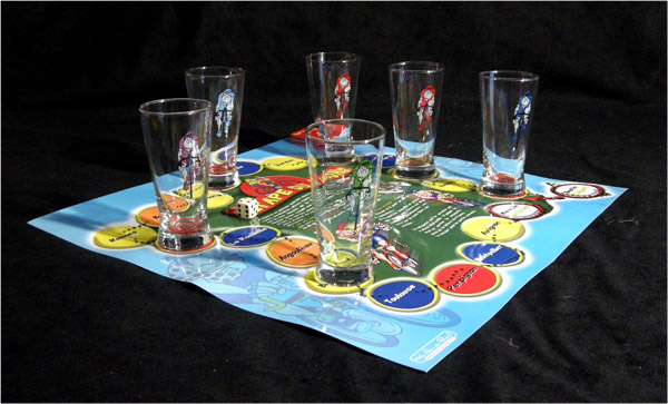 The counters in the game are glasses, which are to be filled (with pastis, of course) and emptied whenever a player lands on a yellow field. Beware, the glasses are not exactly small!