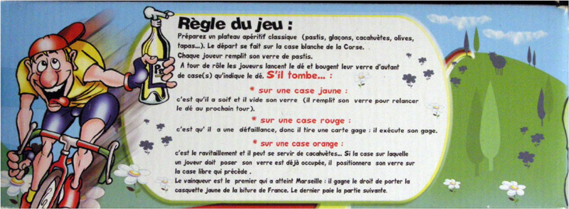 Included with the game is a yellow cap (as in the Laurent Fignon game), but here the legend on the cap says ""Vainqueur de la biture de France" ("biture" means alcoholic drink).
