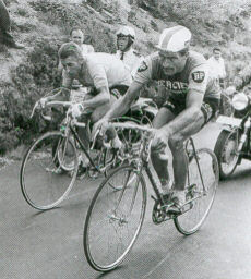 Though the game does not have a date printed, it is not difficult to date: the first two riders pictured on the box are Anquetil and Poulidor in their St Raphael and Mercier costumes (the third rider, by the way, wears a Fernel t-shirt). Anquetil and Poulidor were rivals in 1962, 1963 and, specially, in 1964. The box illustration is obvioulsly inspired in the famous 1964 Puy De Dôme stage.