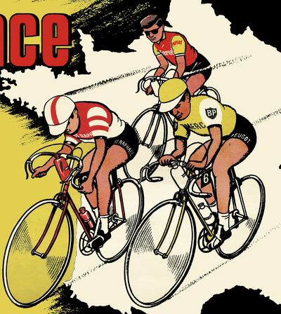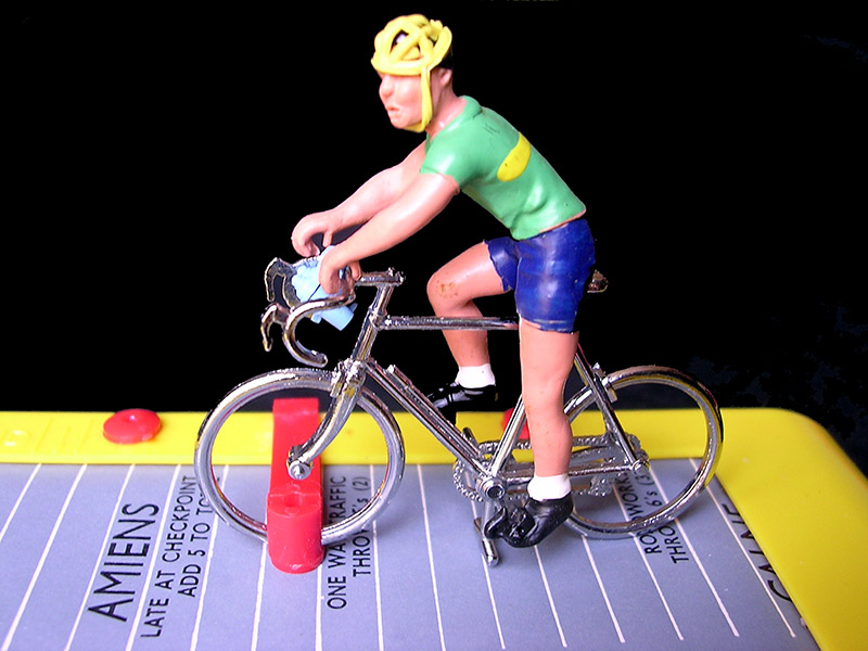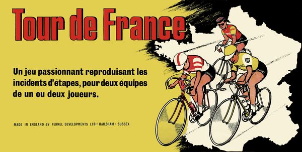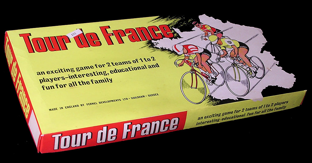 UPDATE 2025: Siegfried L. has spotted at least five different versions of this game based on car rallies. There are two Rallye Monte-Carlo versions of the game (you can see them here (1st edition) and here (2nd edition). And then there is an East African Safari version and at least two London-Brighton Veteran Car Run games. He has dated these games according to the cars present, and from that and from the materials used, he argues that the cycling game should not be from before 1967. Considering Siegfried's knowledge and his impressive research skills (check here to see what I mean), his opinion should be seriously considered. Thanks, Siegfried, for the links and for your comments.